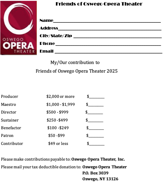 The Oswego Opera Theater exists because of the support from our community. We need your help to continue bringing quality music and education to our community. Click here for Credit Card Donations to Oswego Opera |